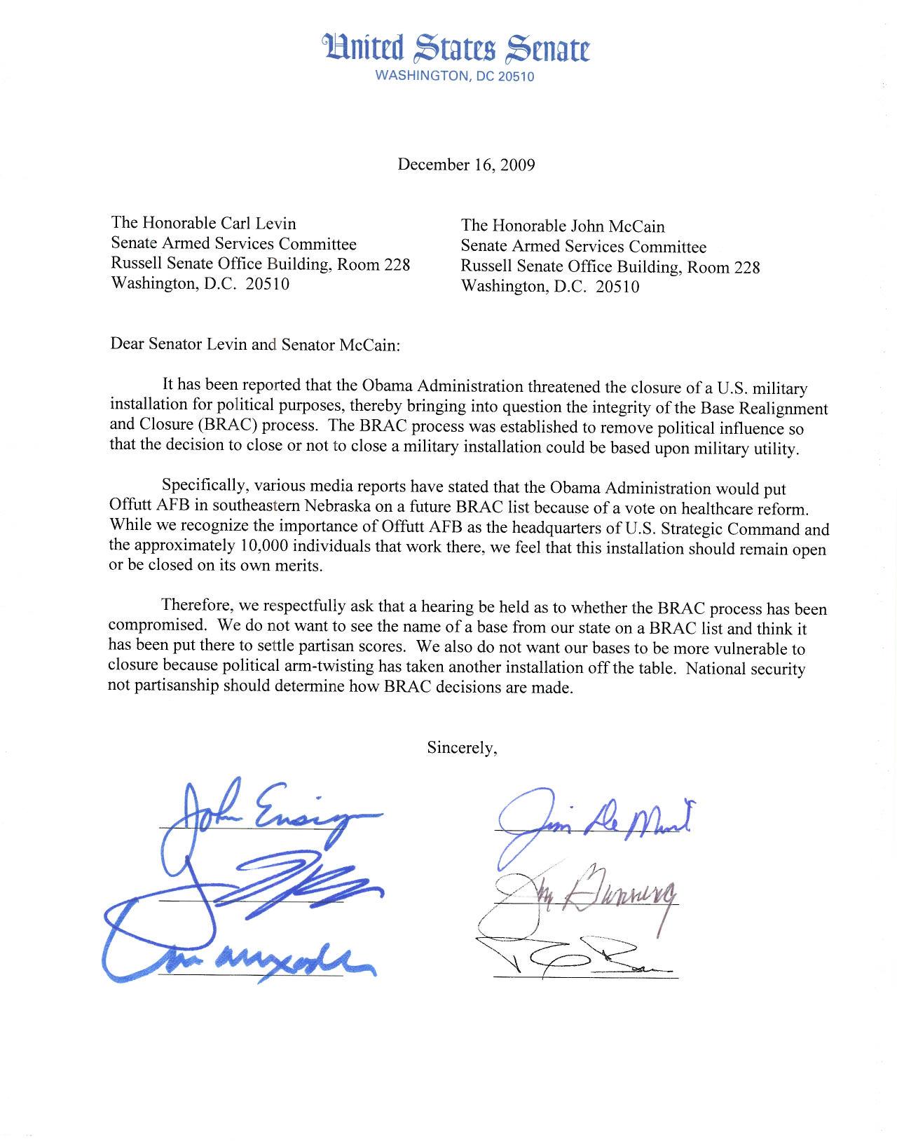 “Twenty Republican senators have requested that the Senate Armed Services Committee launch an investigation into reports that the Obama White House threatened to close Nebraska’s Offutt Air Force base unless Nebraska Senator Ben Nelson fell into line on health care. Those reports first appeared on this blog. In the letter to Senators Levin and McCain, the committee chairman and ranking member, the 20 ask that “a hearing be held as to whether the BRAC process has been compromised.”