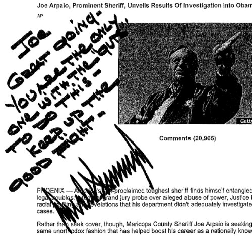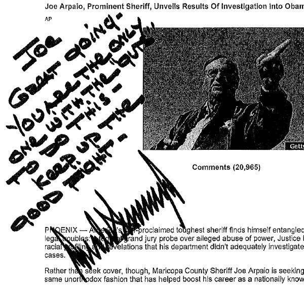 Having printed out an Associated Press report of the event that featured a photograph of Arpaio and published by the Huffington Post, Trump penned diagonally in the upper left hand corner, “Joe – Great going – You are the only one with the ‘guts’ to do this – Keep up the good fight – Donald Trump.”