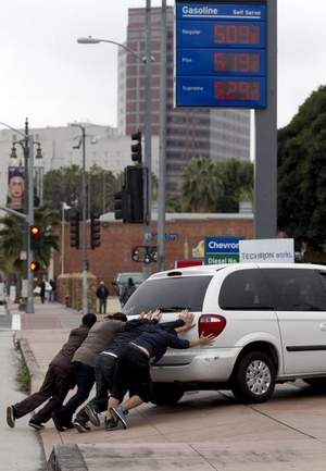 Pedestrians help push a motorist who ran out of gas Friday into a station in downtown Los Angeles, where prices topped $5 per gallon. / Damian Dovarganes / Associated Press