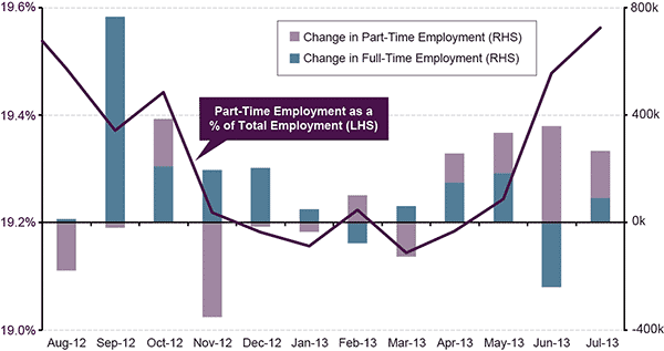 Growth in part-time jobs has been the main contributor in overall employment increases since the start of 2013. Over the past seven months, the average monthly growth in full-time jobs has been 32,000, while the average number of new part-time jobs was 104,000. After falling from the recession peak of 20 percent, the share of total jobs which are part-time has recently rebounded to 19.6 percent. The increase in part-time jobs may be partially attributable to the upcoming change in healthcare laws, requiring employers to provide health insurance to full-time employees but not for part-time workers. If the trend continues, the increasing share of part-time workers may add downward pressure to aggregate labor earnings and reduce consumption growth.”