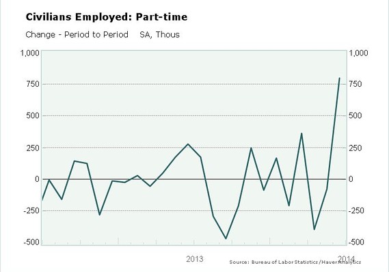 While it’s a number that flops around from month to month — the standard deviation is 287,000 — it jumped by 799,000, which was the largest one-month gain since January 1994. At the same time, there was a 523,000-person drop in full-time workers, the first decline since October.”