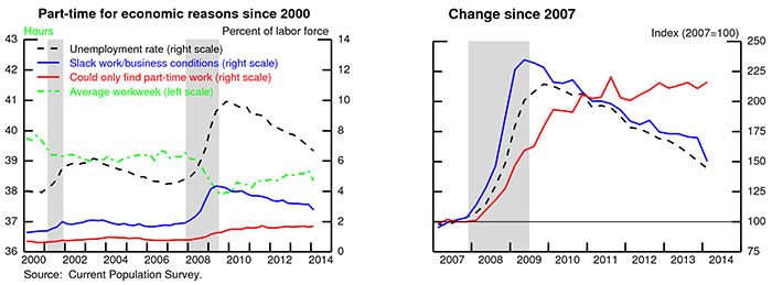Chart 1 presents the two main categories of involuntary part-time work: i) individuals who work part time due to slack work or unfavorable business conditions, and ii) individuals who could only find part-time work, each as a percentage of the labor force (left panel) and for each its change since 2007 (right panel). For comparison purposes, we also plot the unemployment rate and average weekly hours by persons at work (the workweek). The decomposition in Chart 1 yields our first observation: although the share of individuals in the labor force working part time due to slack work or business conditions has declined roughly along with the unemployment rate, the percentage of individuals reporting they could only find part-time work has continued to increase.”