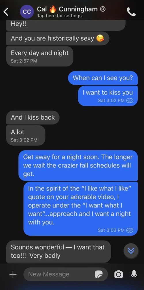 Cunningham refers to Guzman Todd in the text messages below as “historically sexy,” imagines kissing her, says he has been dreaming “of our time together,” and the two plan for Cunningham to make up an excuse for his family and ditch a staffer so the two can meet and, in Guzman Todd’s words, “kiss a lot.” Guzman Todd says she wants “a night with you” and Cunningham agrees that he wants that too. Guzman Todd says that “the only thing I want on my to do list is you” and Cunningham says that “Sounds so hot and so fun!”