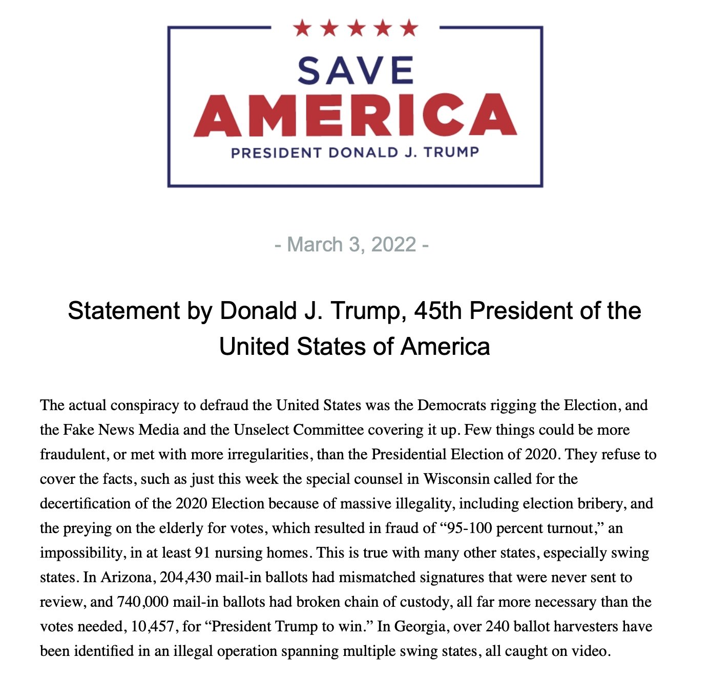 President Trump statement text Mar 3, 2022 “Democrats rigging the Election”, Fake News Media and the Unselect Committee coverup, “Wisconsin called for the decertification of the 2020 Election”
