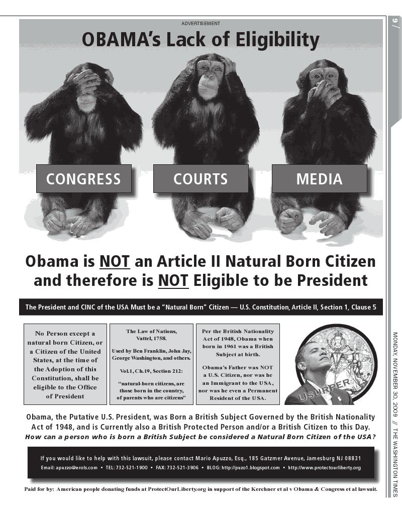Many of those alarmed by the constitutional crisis created by Barack Obama’s avoidance of proof of eligibilty are in the US Military. Some of those are high ranking officers. One of those is Charles Kerchner, lead plaintiff in Kerchner V Obama and Congress. Charles Kerchner is a retired US Navy Commander. Mr. Kerchner and his attorney, Mario Apuzzo, placed this ad in the Washington Times yesterday.