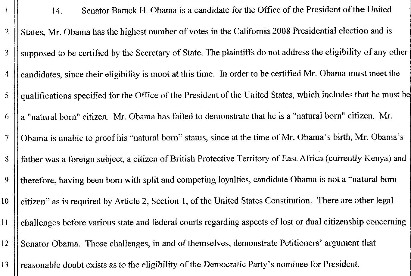 The state of Hawaii statute 338-5 allows one to get a birth certificate based on a statement of one relative only without any corroborative evidence from any hospital. Respondent Obama refused to unseal a birthing file (labor and delivery file) evidencing his birth from the Kapiolani Hospital where he recently decided, that he was born. Similarly, respondent Obama refused to consent to unseal his original birth certificate from the Health Department in the state of Hawaii. The original birth certificate is supposed to provide the name of th! e hospital, name of the attending physician and signatures of individuals in attendance during birth. As such there is no verifiable and legally acceptable evidence of his birth in the state of Hawaii.