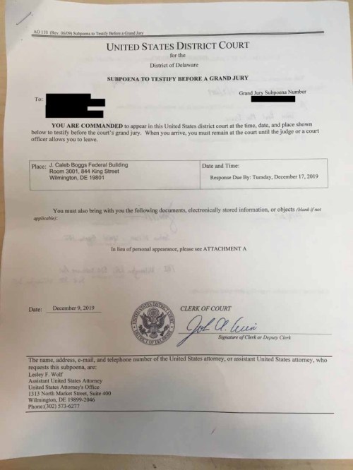 • A subpoena was issued December 9, 2019 by US Attorney Lesley Wolf. (see below).