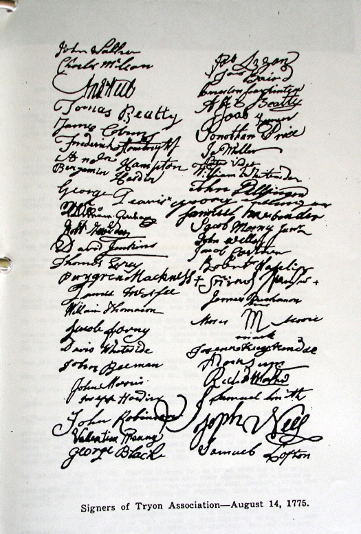 “The unprecedented, barbarous and bloody actions committed by British troops on our American brethren near Boston, on 19th April and 20th of May last, together with the hostile operations and treacherous designs now carrying on, by the tools of ministerial vengeance, for the subjugation of all British America, suggest to us the painful necessity of having recourse to arms in defense of our National freedom and constitutional rights, against all invasions; and at the same time do solemnly engage to take up arms and risk our lives and our fortunes in maintaining the freedom of our country whenever the wisdom and counsel of the Continental Congress or our Provincial Convention shall declare it necessary; and this engagement we will continue in for the preservation of those rights and liberties which the principals of our Constitution and the laws of God, nature and nations have made it our duty to defend. We therefore, the subscribers, freeholders and inhabitants of Tryon County, do here by faithfully unite ourselves under the most solemn ties of religion, honor and love to our county, firmly to resist force by force, and hold sacred till a reconciliation shall take place between Great Britain and America on Constitutional principals, which we most ardently desire, and do firmly agree to hold all such persons as inimical to the liberties of America who shall refuse to sign this association.”