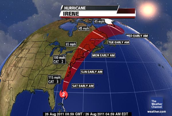 Hurricane Irene projected path Friday August 26, 2011, Category 3, NC coast, Norfolk, Washington, D.C., Baltimore, Philadelphia, New York City, Hartford,  Boston